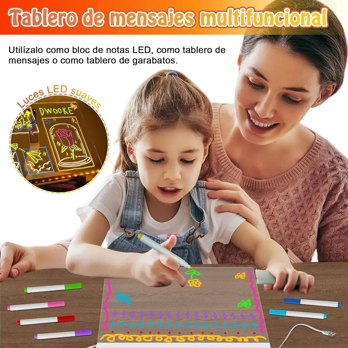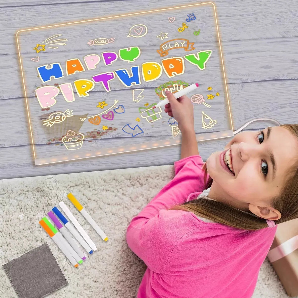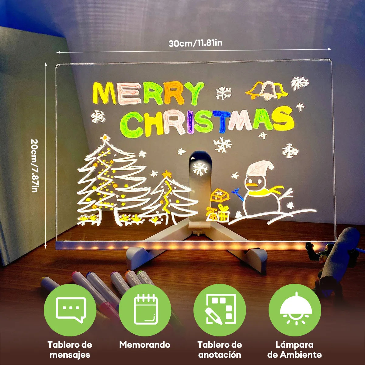 Gracias a su superficie acrílica de alta transparencia y sus 7 marcadores de colores neón, cada trazo cobra vida con un brillo que atrapa miradas. Ideal para notas, dibujos, listas y recordatorios que no pasarán desapercibidos. ¡Tu creatividad nunca estuvo tan bien iluminada!